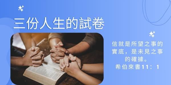 踏入考試季節,讓我們想想考試所謂何事。在現今社會,考試幾乎是每個人都遇過的事情。有沒有想過在聖經中,也有「考試」這回事?不過,所用的詞語是「試驗」:「因為知道你們的信心經過試驗,就生忍耐。」(雅各書1:3)舊約聖經中的亞伯拉罕(又名亞伯蘭),曾參加不同的「考試」,有些獲得優異成績,被嘉許為「信心之父」。究竟亞伯拉罕的試卷是怎樣?他又如何作答?